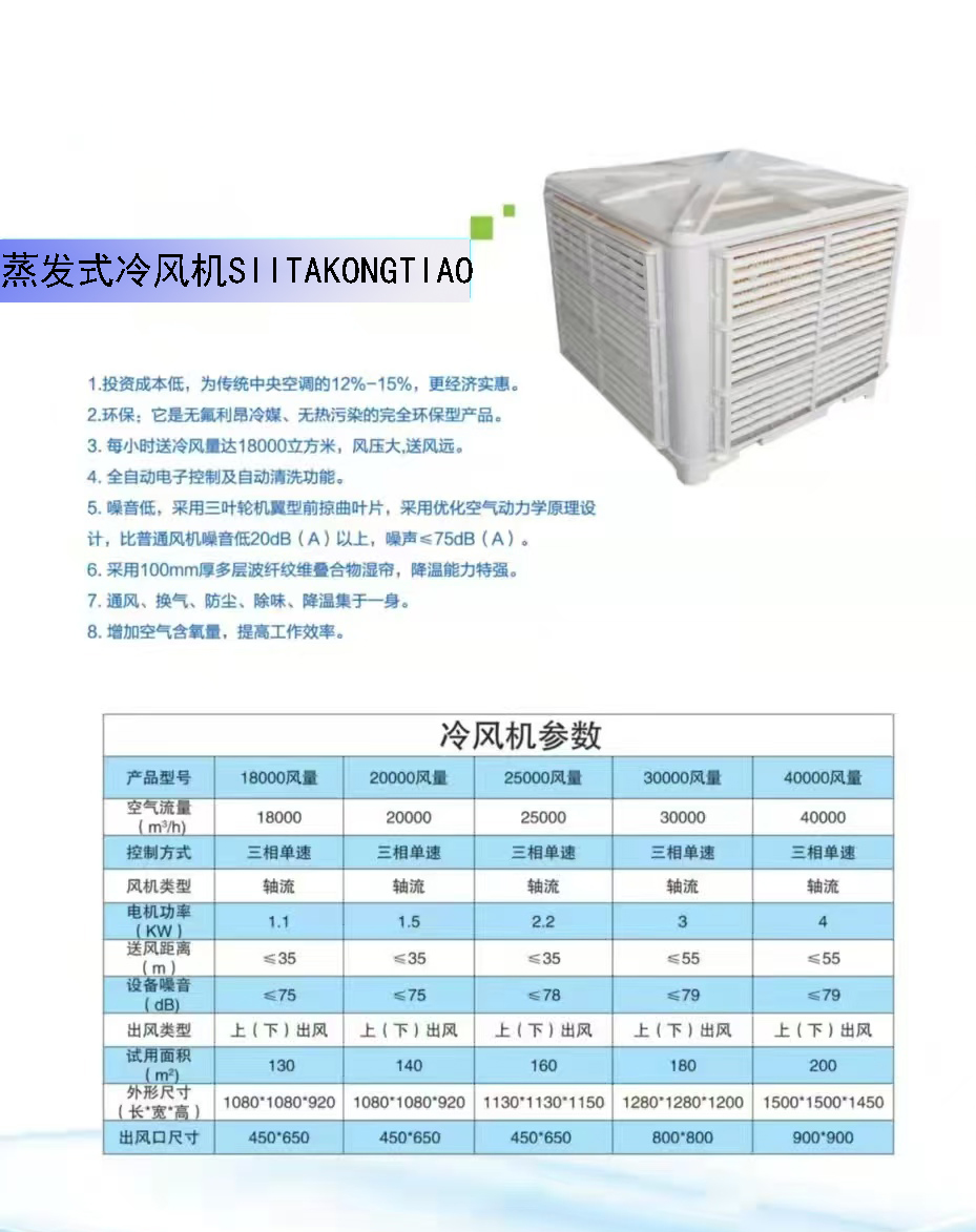 從工廠車間到商業場所,從倉儲物流到戶外臨時空間,蒸發式冷風機憑借靈活便捷的安裝方式與卓越性能,成為各行業的降溫優選。模塊化設計支持多臺組合,滿足不同場景需求;智能控制系統可遠程調節風速、濕度,操作簡單便捷。選擇蒸發式冷風機,不僅是選擇一份清涼,更是擁抱一種綠色節能的生活方式。